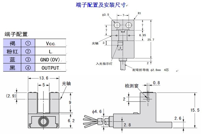 ● “L”引線與“+”引線相接時,輸出狀態即時轉換如:設傳感器現態為受光時指示燈亮、“out”沒有輸出電流,相接后指示燈仍亮、但“out”有輸出電流。其它各引腳接線錯誤時,傳感器不工作,但傳感器本身不會損壞;